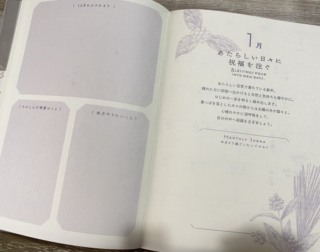 毎月の扉ページには、その月に合わせたメッセージが添えられ、季節の移り変わりを感じさせてくれます。